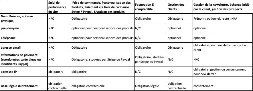 Le tableau ci-dessous liste les données personnelles collectées, les processus les utilisant, et les bases légales de traitement de ces données. N/C signifie Non Collectées: